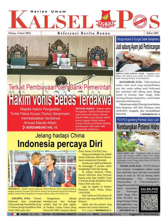 Hakim vonis Bebas Terdakwa, Terkait Pembiayaan oleh Bank Pemerintah Zainal2 Juni 202516 Juni 2025514 views Hakim vonis Bebas Terdakwa, Terkait Pembiayaan oleh Bank Pemerintah Indonesia percaya Diri, Jelang hadapi China Judi sabung Ayam jadi Perbincangan, Diduga terjadi di Sungai Salak Banjarbaru Kembangkan Potensi Hidro, PLN PLN gandeng Pemkab Gayo Lues Download Epaper Disini Bacaan LainnyaTerkait Korupsi Dana Desa Rp657 juta, Eks Kades di Kusan Hilir divonis 3 TahunDireksi baru PAM Bandarmasih terbentuk, Zulbadi dipercaya jadi DirutParkir Pasar Wadai ‘mencekik’, Pengendara Motor ditagih Rp10 Ribu Download Epaper Disini Kalsel Pos Berita Terkini, Kabar Terbaru Hari ini Banjarmasin Kalimantan Selatan dan Nasional Pos terkaitTerkait Korupsi Dana Desa Rp657 juta, Eks Kades di Kusan Hilir divonis 3 TahunDireksi baru PAM Bandarmasih terbentuk, Zulbadi dipercaya jadi DirutParkir Pasar Wadai ‘mencekik’, Pengendara Motor ditagih Rp10 Ribu