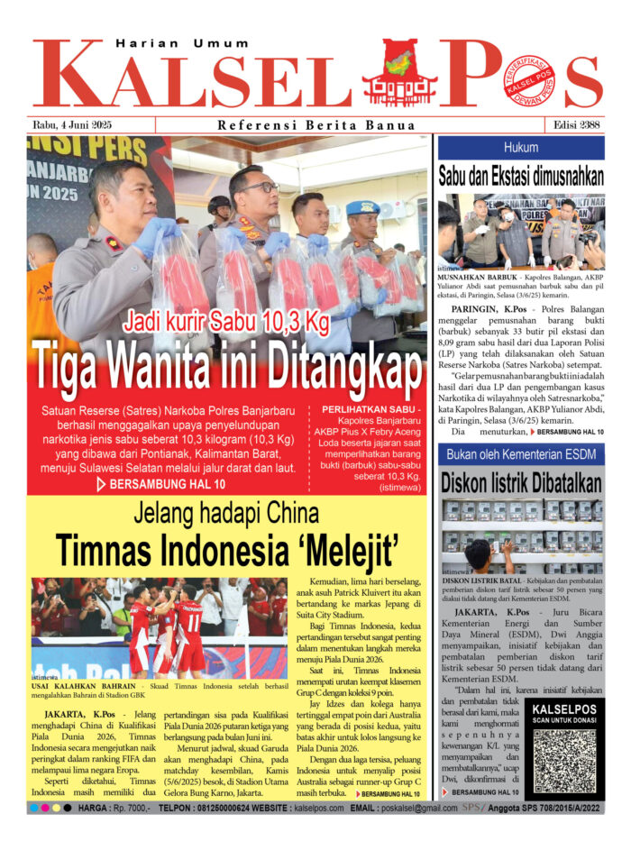 Tiga Wanita ini Ditangkap, Jadi kurir Sabu 10,3 Kg Zainal3 Juni 2025530 views Tiga Wanita ini Ditangkap, Jadi kurir Sabu 10,3 Kg Timnas Indonesia ‘Melejit’, Jelang hadapi China Sabu dan Ekstasi dimusnahkan Diskon listrik Dibatalkan, Bukan oleh Kementerian ESDM Download Epaper Disini Bacaan LainnyaTerkait Korupsi Dana Desa Rp657 juta, Eks Kades di Kusan Hilir divonis 3 TahunDireksi baru PAM Bandarmasih terbentuk, Zulbadi dipercaya jadi DirutParkir Pasar Wadai ‘mencekik’, Pengendara Motor ditagih Rp10 Ribu Download Epaper Disini Kalsel Pos Berita Terkini, Kabar Terbaru Hari ini Banjarmasin Kalimantan Selatan dan Nasional Pos terkaitTerkait Korupsi Dana Desa Rp657 juta, Eks Kades di Kusan Hilir divonis 3 TahunDireksi baru PAM Bandarmasih terbentuk, Zulbadi dipercaya jadi DirutParkir Pasar Wadai ‘mencekik’, Pengendara Motor ditagih Rp10 Ribu