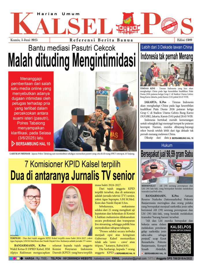 Malah dituding Mengintimidasi, Bantu mediasi Pasutri Cekcok Zainal5 Juni 2025466 views Malah dituding Mengintimidasi, Bantu mediasi Pasutri Cekcok Dua di antaranya Jurnalis TV senior, 7 Komisioner KPID Kalsel terpilih Indonesia tak pernah Menang, Lebih dari 3 Dekade lawan China Bersepakat jual 98,59 gram Sabu Download Epaper PDF Disini Bacaan LainnyaTerkait Korupsi Dana Desa Rp657 juta, Eks Kades di Kusan Hilir divonis 3 TahunDireksi baru PAM Bandarmasih terbentuk, Zulbadi dipercaya jadi DirutParkir Pasar Wadai ‘mencekik’, Pengendara Motor ditagih Rp10 Ribu Download Epaper PDF Disini Kalsel Pos Berita Terkini, Kabar Terbaru Hari ini Banjarmasin Kalimantan Selatan dan Nasional Pos terkaitTerkait Korupsi Dana Desa Rp657 juta, Eks Kades di Kusan Hilir divonis 3 TahunDireksi baru PAM Bandarmasih terbentuk, Zulbadi dipercaya jadi DirutParkir Pasar Wadai ‘mencekik’, Pengendara Motor ditagih Rp10 Ribu