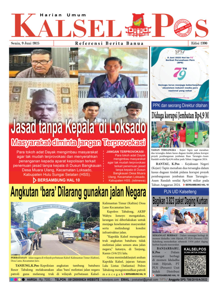 Jasad tanpa Kepala’ di Loksado, Masyarakat diminta jangan Terprovokasi Zainal9 Juni 2025643 views Jasad tanpa Kepala’ di Loksado, Masyarakat diminta jangan Terprovokasi Angkutan ‘bara’ Dilarang gunakan jalan Negara Diduga korupsi Jembatan Rp4,9 M, PPK dan seorang Direktur ditahan PLN UID Kalselteng, Bagikan 3.823 paket Daging Kurban Download Epaper Disini Bacaan LainnyaTerkait Korupsi Dana Desa Rp657 juta, Eks Kades di Kusan Hilir divonis 3 TahunDireksi baru PAM Bandarmasih terbentuk, Zulbadi dipercaya jadi DirutParkir Pasar Wadai ‘mencekik’, Pengendara Motor ditagih Rp10 Ribu Download Epaper Disini Kalsel Pos Berita Terkini, Kabar Terbaru Hari ini Banjarmasin Kalimantan Selatan dan Nasional Pos terkaitTerkait Korupsi Dana Desa Rp657 juta, Eks Kades di Kusan Hilir divonis 3 TahunDireksi baru PAM Bandarmasih terbentuk, Zulbadi dipercaya jadi DirutParkir Pasar Wadai ‘mencekik’, Pengendara Motor ditagih Rp10 Ribu