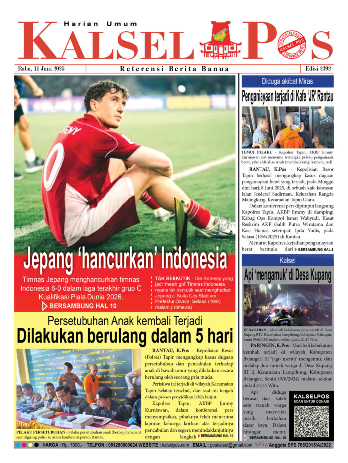 Dilakukan berulang dalam 5 hari, Persetubuhan Anak kembali Terjadi Zainal10 Juni 202516 Juni 2025504 views Jepang ‘hancurkan’ Indonesia Dilakukan berulang dalam 5 hari, Persetubuhan Anak kembali Terjadi Penganiayaan terjadi di Kafe ‘JR’ Rantau, Diduga akibat Miras Api ‘mengamuk’ di Desa Kupang Download Epaper Disini Bacaan LainnyaTerkait Korupsi Dana Desa Rp657 juta, Eks Kades di Kusan Hilir divonis 3 TahunDireksi baru PAM Bandarmasih terbentuk, Zulbadi dipercaya jadi DirutParkir Pasar Wadai ‘mencekik’, Pengendara Motor ditagih Rp10 Ribu Download Epaper Disini Kalsel Pos Berita Terkini, Kabar Terbaru Hari ini Banjarmasin Kalimantan Selatan dan Nasional Pos terkaitTerkait Korupsi Dana Desa Rp657 juta, Eks Kades di Kusan Hilir divonis 3 TahunDireksi baru PAM Bandarmasih terbentuk, Zulbadi dipercaya jadi DirutParkir Pasar Wadai ‘mencekik’, Pengendara Motor ditagih Rp10 Ribu