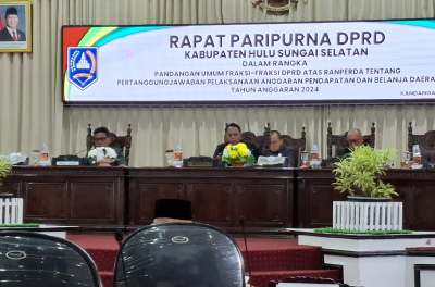 Kandangan, kalselpos.com– Wakil Bupati (Wabup) Hulu Sungai Selatan (HSS) Suriani menghadiri rapat paripurna penyampaikan pandangan umum fraksi-fraksi terhadap laporan Keterangan Pertanggungjawaban (LKPj) Anggaran Pendapatan dan Belanja Daerah (APBD) tahun 2024, Selasa (10/6/2025).