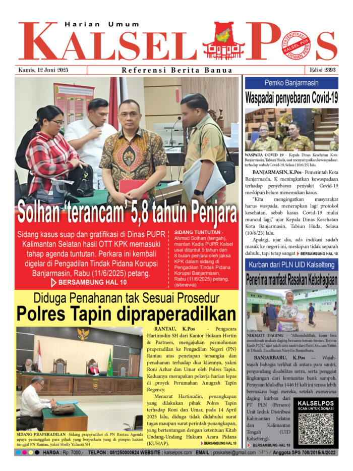 Solhan ‘terancam’ 5,8 tahun Penjara Zainal12 Juni 202516 Juni 2025547 views Solhan ‘terancam’ 5,8 tahun Penjara Polres Tapin dipraperadilkan, Diduga Penahanan tak Sesuai Prosedur Waspadai penyebaran Covid-19 Penerima manfaat Rasakan Kebahagiaan, Kurban dari PLN UID Kalselteng Download Epaper Disini Bacaan LainnyaTiga sopir Positif narkoba, Terjaring razia tes Urine BNNK BalanganParkir “Nakal” Pasar Wadai disikat, Lahan yang Tarik Rp10 Ribu disegelBuruh dikeroyok Hingga Tewas, Tersangka Pelaku Serahkan Diri Download Epaper Disini Kalsel Pos Berita Terkini, Kabar Terbaru Hari ini Banjarmasin Kalimantan Selatan dan Nasional Pos terkaitTiga sopir Positif narkoba, Terjaring razia tes Urine BNNK BalanganParkir “Nakal” Pasar Wadai disikat, Lahan yang Tarik Rp10 Ribu disegelBuruh dikeroyok Hingga Tewas, Tersangka Pelaku Serahkan Diri
