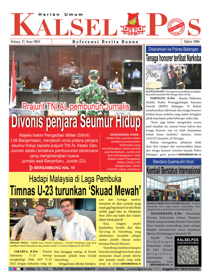 Divonis penjara Seumur Hidup, Prajurit TNI AL pembunuh Jurnalis Zainal16 Juni 2025467 views Divonis penjara Seumur Hidup, Prajurit TNI AL pembunuh Jurnalis Timnas U-23 turunkan ‘Skuad Mewah’, Hadapi Malaysia di Laga Pembuka Tenaga honorer terlibat Narkoba, Diserahkan ke Polres Balangan Kembali Berstatus Internasional, Bandara Syamsudin Noor Download Epaper Disini Bacaan LainnyaTerkait Korupsi Dana Desa Rp657 juta, Eks Kades di Kusan Hilir divonis 3 TahunDireksi baru PAM Bandarmasih terbentuk, Zulbadi dipercaya jadi DirutParkir Pasar Wadai ‘mencekik’, Pengendara Motor ditagih Rp10 Ribu Download Epaper Disini Kalsel Pos Berita Terkini, Kabar Terbaru Hari ini Banjarmasin Kalimantan Selatan dan Nasional Pos terkaitTerkait Korupsi Dana Desa Rp657 juta, Eks Kades di Kusan Hilir divonis 3 TahunDireksi baru PAM Bandarmasih terbentuk, Zulbadi dipercaya jadi DirutParkir Pasar Wadai ‘mencekik’, Pengendara Motor ditagih Rp10 Ribu