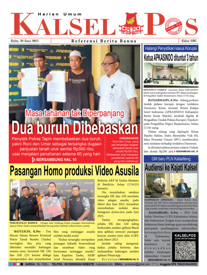 Dua buruh Dibebaskan, Masa tahanan tak Diperpanjang Zainal18 Juni 2025292 views Dua buruh Dibebaskan, Masa tahanan tak Diperpanjang Pasangan Homo produksi Video Asusila Ketua APKASINDO dituntut 3 tahun, Halangi Penyidikan kasus Korupsi Audiensi ke Kajati Kalsel, GM baru PLN Kalselteng Download Epaper Disini Bacaan LainnyaTerkait Korupsi Dana Desa Rp657 juta, Eks Kades di Kusan Hilir divonis 3 TahunDireksi baru PAM Bandarmasih terbentuk, Zulbadi dipercaya jadi DirutParkir Pasar Wadai ‘mencekik’, Pengendara Motor ditagih Rp10 Ribu Download Epaper Disini Kalsel Pos Berita Terkini, Kabar Terbaru Hari ini Banjarmasin Kalimantan Selatan dan Nasional Pos terkaitTerkait Korupsi Dana Desa Rp657 juta, Eks Kades di Kusan Hilir divonis 3 TahunDireksi baru PAM Bandarmasih terbentuk, Zulbadi dipercaya jadi DirutParkir Pasar Wadai ‘mencekik’, Pengendara Motor ditagih Rp10 Ribu