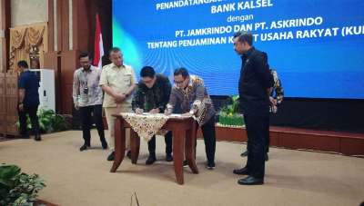 Usai Rakor, Menteri UMKM RI, ikut menyaksikan penandatanganan nota kesepakatan antara Bank Kalsel dengan PT Jamkrindo dan PT Askrindo, tentang penjaminan Kredit Usaha Rakyat (KUR). Penandatangan dilakukan langsung Direktur Utama Bank Kalsel, Fachrudin.