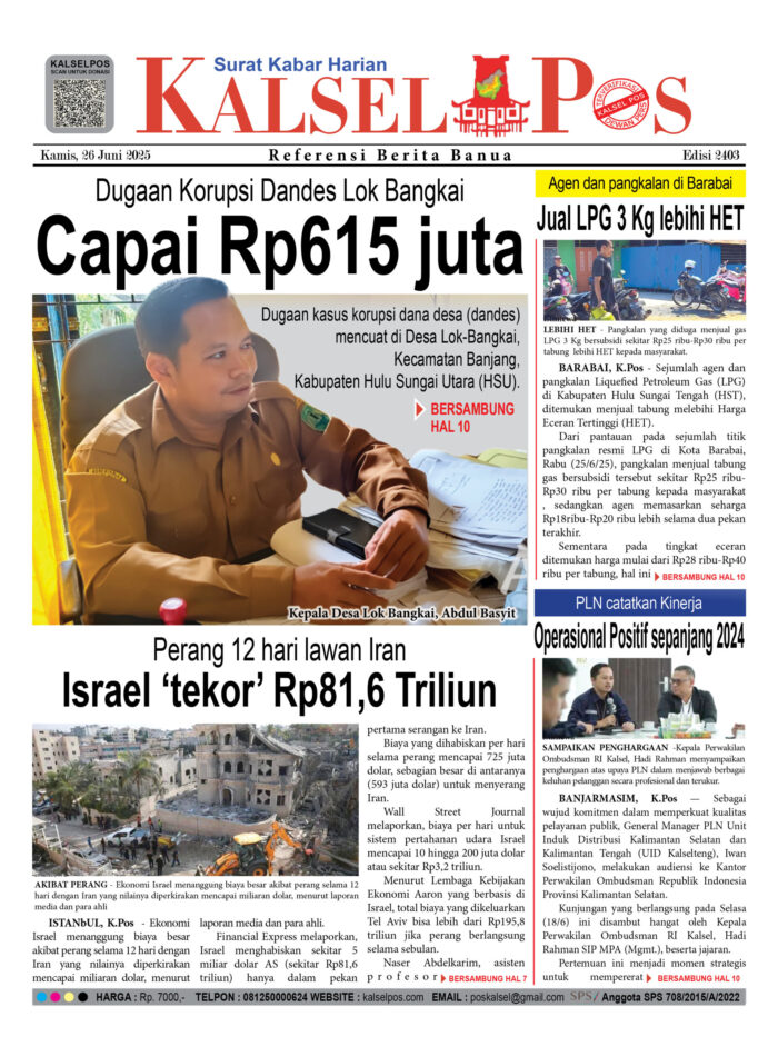 Capai jumlah Rp615 juta, Dugaan Korupsi Dandes Lok Bangkai Zainal26 Juni 2025661 views Capai jumlah Rp615 juta, Dugaan Korupsi Dandes Lok Bangkai Israel ‘tekor’ Rp81,6 Triliun, Perang 12 hari lawan Iran Jual LPG 3 Kg lebihi HET, Agen dan pangkalan di Barabai Audiensi ke Ombudsman Kalsel, GM PLN UID Kalselteng Download Epaper PDF Disini Bacaan LainnyaTerkait Korupsi Dana Desa Rp657 juta, Eks Kades di Kusan Hilir divonis 3 TahunDireksi baru PAM Bandarmasih terbentuk, Zulbadi dipercaya jadi DirutParkir Pasar Wadai ‘mencekik’, Pengendara Motor ditagih Rp10 Ribu Download Epaper PDF Disini Kalsel Pos Berita Terkini, Kabar Terbaru Hari ini Banjarmasin Kalimantan Selatan dan Nasional Pos terkaitTerkait Korupsi Dana Desa Rp657 juta, Eks Kades di Kusan Hilir divonis 3 TahunDireksi baru PAM Bandarmasih terbentuk, Zulbadi dipercaya jadi DirutParkir Pasar Wadai ‘mencekik’, Pengendara Motor ditagih Rp10 Ribu