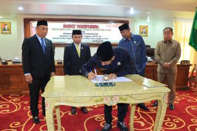 Penandatanganan berlangsung di Gedung DPRD Tapin, ditandatangani langsung oleh Bupati H. Yamani, Ketua DPRD Achmad Riduan Syah, serta dua Wakil Ketua, H. Hairuji dan H. Midpay Syahbani.