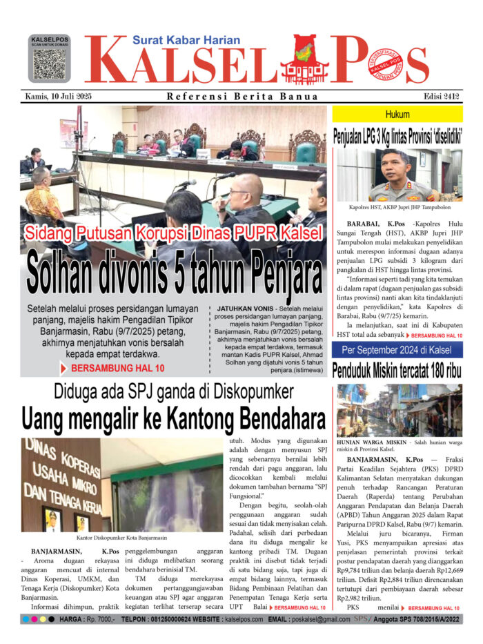 Solhan divonis 5 tahun Penjara, Sidang Putusan Korupsi Dinas PUPR Kalsel Zainal10 Juli 2025562 views Solhan divonis 5 tahun Penjara, Sidang Putusan Korupsi Dinas PUPR Kalsel Uang mengalir ke Kantong Bendahara, Diduga ada SPJ ganda di Diskopumker Penjualan LPG 3 Kg lintas Provinsi ‘diselidiki’ Penduduk Miskin tercatat 180 ribu, Per September 2024 di Kalsel Download Epaper PDF Disini Bacaan LainnyaTerkait Korupsi Dana Desa Rp657 juta, Eks Kades di Kusan Hilir divonis 3 TahunDireksi baru PAM Bandarmasih terbentuk, Zulbadi dipercaya jadi DirutParkir Pasar Wadai ‘mencekik’, Pengendara Motor ditagih Rp10 Ribu Download Epaper PDF Disini Kalsel Pos Berita Terkini, Kabar Terbaru Hari ini Banjarmasin Kalimantan Selatan dan Nasional Pos terkaitTerkait Korupsi Dana Desa Rp657 juta, Eks Kades di Kusan Hilir divonis 3 TahunDireksi baru PAM Bandarmasih terbentuk, Zulbadi dipercaya jadi DirutParkir Pasar Wadai ‘mencekik’, Pengendara Motor ditagih Rp10 Ribu