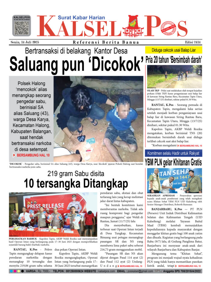 Saluang pun ‘Dicokok’, Bertransaksi di belakang Kantor Desa Zainal13 Juli 2025515 views Saluang pun ‘Dicokok’, Bertransaksi di belakang Kantor Desa 10 tersangka Ditangkap, 219 gram Sabu disita Pria 20 tahun ‘Bersimbah darah’, Diduga cekcok usai Balap Liar YBM PLN gelar Khitanan Gratis, Komitmen selalu Hadir untuk Rakyat Download Epaper PDF Disini Bacaan LainnyaTerkait Korupsi Dana Desa Rp657 juta, Eks Kades di Kusan Hilir divonis 3 TahunDireksi baru PAM Bandarmasih terbentuk, Zulbadi dipercaya jadi DirutParkir Pasar Wadai ‘mencekik’, Pengendara Motor ditagih Rp10 Ribu Download Epaper PDF Disini Kalsel Pos Berita Terkini, Kabar Terbaru Hari ini Banjarmasin Kalimantan Selatan dan Nasional Pos terkaitTerkait Korupsi Dana Desa Rp657 juta, Eks Kades di Kusan Hilir divonis 3 TahunDireksi baru PAM Bandarmasih terbentuk, Zulbadi dipercaya jadi DirutParkir Pasar Wadai ‘mencekik’, Pengendara Motor ditagih Rp10 Ribu