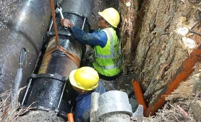BANJARMASIN, Kalselpos.com – Terjadi kebocoran pada pipa transfer HDPE dia. 500 mm di Jalan Pemurus Luar, tepatnya di seberang Puskesmas Kertak Hanyar.