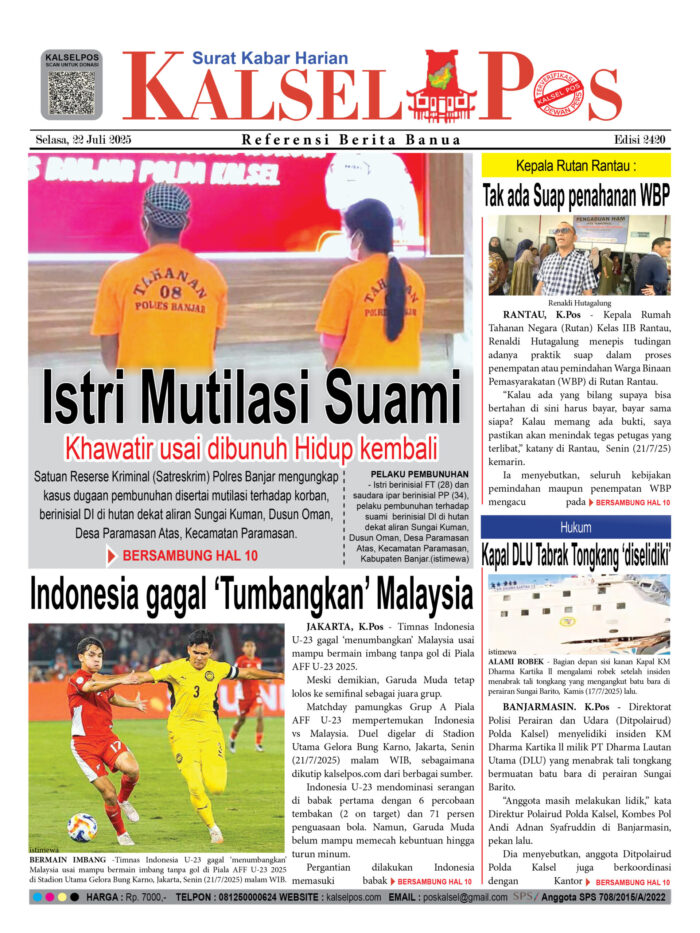 Istri Mutilasi Suami, Khawatir usai dibunuh Hidup kembali Zainal22 Juli 2025554 views Istri Mutilasi Suami, Khawatir usai dibunuh Hidup kembali Indonesia gagal ‘Tumbangkan’ Malaysia Kepala Rutan Rantau :Tak ada Suap penahanan WBP Kapal DLU Tabrak Tongkang ‘diselidiki’ Download Epaper PDF Disini Bacaan LainnyaTerkait Korupsi Dana Desa Rp657 juta, Eks Kades di Kusan Hilir divonis 3 TahunDireksi baru PAM Bandarmasih terbentuk, Zulbadi dipercaya jadi DirutParkir Pasar Wadai ‘mencekik’, Pengendara Motor ditagih Rp10 Ribu Download Epaper PDF Disini Kalsel Pos Berita Terkini, Kabar Terbaru Hari ini Banjarmasin Kalimantan Selatan dan Nasional Pos terkaitTerkait Korupsi Dana Desa Rp657 juta, Eks Kades di Kusan Hilir divonis 3 TahunDireksi baru PAM Bandarmasih terbentuk, Zulbadi dipercaya jadi DirutParkir Pasar Wadai ‘mencekik’, Pengendara Motor ditagih Rp10 Ribu