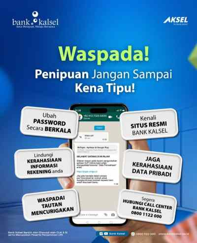 Bank Kalsel juga mengingatkan pentingnya menjaga kerahasiaan data pribadi serta melakukan tindakan pencegahan, seperti mengganti password secara berkala, hanya mengakses situs resmi bank, dan tidak mengklik tautan dari sumber yang tidak jelas.