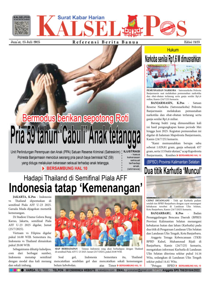 Pria 59 tahun ‘Cabuli’ Anak tetangga Zainal25 Juli 202525 Juli 2025654 views Pria 59 tahun ‘Cabuli’ Anak tetangga, Bermodus berikan sepotong Roti Indonesia tatap ‘Kemenangan’, Hadapi Thailand di Semifinal Piala AFF Narkoba senilai Rp1,6 M dimusnahkan Dua titik Karhutla ‘Muncul’ Download Epaper PDF Disini Bacaan LainnyaTerkait Korupsi Dana Desa Rp657 juta, Eks Kades di Kusan Hilir divonis 3 TahunDireksi baru PAM Bandarmasih terbentuk, Zulbadi dipercaya jadi DirutParkir Pasar Wadai ‘mencekik’, Pengendara Motor ditagih Rp10 Ribu Download Epaper PDF Disini Kalsel Pos Berita Terkini, Kabar Terbaru Hari ini Banjarmasin Kalimantan Selatan dan Nasional Pos terkaitTerkait Korupsi Dana Desa Rp657 juta, Eks Kades di Kusan Hilir divonis 3 TahunDireksi baru PAM Bandarmasih terbentuk, Zulbadi dipercaya jadi DirutParkir Pasar Wadai ‘mencekik’, Pengendara Motor ditagih Rp10 Ribu