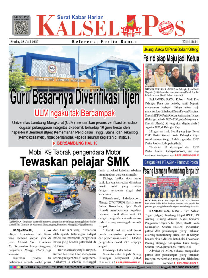 Guru Besar-nya Diverifikasi Itjen, ULM ngaku tak Berdampak Zainal28 Juli 2025540 views Guru Besar-nya Diverifikasi Itjen, ULM ngaku tak Berdampak Tewaskan pelajar SMK, Mobil K9 Tabrak pengendara Motor Fairid siap Maju jadi Ketua, Jelang Musda XI Partai Golkar Kalteng Pasang Larangan Menambang Tanpa Izin, Satgas Peti PT AGM – Pamovit Polda Download Epaper PDF Disini Bacaan LainnyaTerkait Korupsi Dana Desa Rp657 juta, Eks Kades di Kusan Hilir divonis 3 TahunDireksi baru PAM Bandarmasih terbentuk, Zulbadi dipercaya jadi DirutParkir Pasar Wadai ‘mencekik’, Pengendara Motor ditagih Rp10 Ribu Download Epaper PDF Disini Kalsel Pos Berita Terkini, Kabar Terbaru Hari ini Banjarmasin Kalimantan Selatan dan Nasional Pos terkaitTerkait Korupsi Dana Desa Rp657 juta, Eks Kades di Kusan Hilir divonis 3 TahunDireksi baru PAM Bandarmasih terbentuk, Zulbadi dipercaya jadi DirutParkir Pasar Wadai ‘mencekik’, Pengendara Motor ditagih Rp10 Ribu
