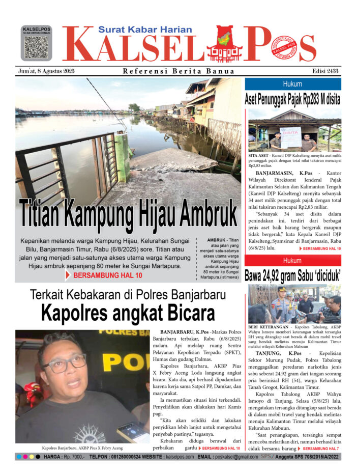 Titian Kampung Hijau Ambruk Zainal7 Agustus 2025583 views Titian Kampung Hijau Ambruk Kapolres angkat Bicara, Terkait Kebakaran di Polres Banjarbaru Aset Penunggak Pajak Rp283 M disita Bawa 24,92 gram Sabu ‘diciduk’ Download Epaper PDF Disini Bacaan LainnyaKetersediaan BBM harus Aman, Jangan sampai Ada ‘Panic Buying’Sidang pembunuhan Mahasiswi ULM, Pecatan Polisi didakwa Pasal BerlapisTimnas ‘menyerah’ 0-1 atas Bulgaria Download Epaper PDF Disini Kalsel Pos Berita Terkini, Kabar Terbaru Hari ini Banjarmasin Kalimantan Selatan dan Nasional Pos terkaitKetersediaan BBM harus Aman, Jangan sampai Ada ‘Panic Buying’Sidang pembunuhan Mahasiswi ULM, Pecatan Polisi didakwa Pasal BerlapisTimnas ‘menyerah’ 0-1 atas Bulgaria