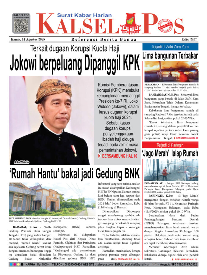 Jokowi berpeluang Dipanggil KPK, Terkait dugaan Korupsi Kuota Haji Zainal14 Agustus 2025557 views Jokowi berpeluang Dipanggil KPK, Terkait dugaan Korupsi Kuota Haji ‘Rumah Hantu’ bakal jadi Gedung BNK Lima bangunan Terbakar, Terjadi di Zafri Zam Zam ‘Jago Merah’ lalap Rumah, Terjadi di Paringin Download Epaper PDF Disini Bacaan LainnyaTerkait Korupsi Dana Desa Rp657 juta, Eks Kades di Kusan Hilir divonis 3 TahunDireksi baru PAM Bandarmasih terbentuk, Zulbadi dipercaya jadi DirutParkir Pasar Wadai ‘mencekik’, Pengendara Motor ditagih Rp10 Ribu Download Epaper PDF Disini Kalsel Pos Berita Terkini, Kabar Terbaru Hari ini Banjarmasin Kalimantan Selatan dan Nasional Pos terkaitTerkait Korupsi Dana Desa Rp657 juta, Eks Kades di Kusan Hilir divonis 3 TahunDireksi baru PAM Bandarmasih terbentuk, Zulbadi dipercaya jadi DirutParkir Pasar Wadai ‘mencekik’, Pengendara Motor ditagih Rp10 Ribu