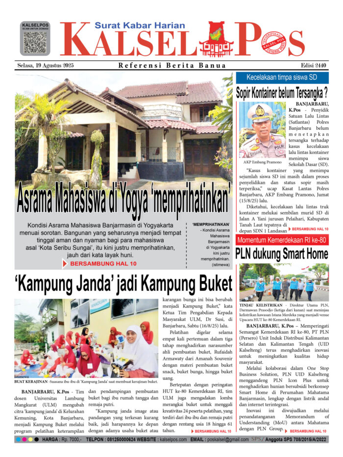 Asrama Mahasiswa di Yogya ‘memprihatinkan’ Zainal18 Agustus 202519 Agustus 2025542 views Asrama Mahasiswa di Yogya ‘memprihatinkan’ ‘Kampung Janda’ jadi Kampung Buket Sopir Kontainer belum Tersangka ?, Kecelakaan timpa siswa SD Pasokan Listrik PLN Andal, Peringatan HUT RI Khidmat dan Meriah Download Epaper PDF Disini Bacaan LainnyaTerkait Korupsi Dana Desa Rp657 juta, Eks Kades di Kusan Hilir divonis 3 TahunDireksi baru PAM Bandarmasih terbentuk, Zulbadi dipercaya jadi DirutParkir Pasar Wadai ‘mencekik’, Pengendara Motor ditagih Rp10 Ribu Download Epaper PDF Disini Kalsel Pos Berita Terkini, Kabar Terbaru Hari ini Banjarmasin Kalimantan Selatan dan Nasional Pos terkaitTerkait Korupsi Dana Desa Rp657 juta, Eks Kades di Kusan Hilir divonis 3 TahunDireksi baru PAM Bandarmasih terbentuk, Zulbadi dipercaya jadi DirutParkir Pasar Wadai ‘mencekik’, Pengendara Motor ditagih Rp10 Ribu