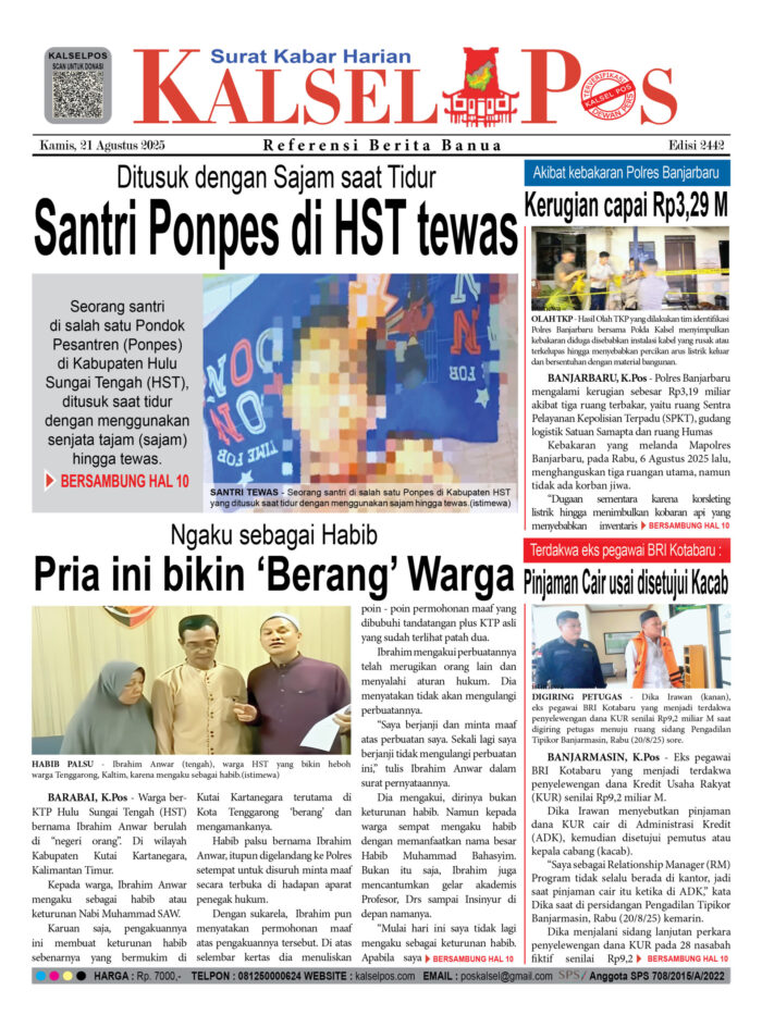 Santri Ponpes di HST tewas, Ditusuk dengan Sajam saat Tidur Zainal20 Agustus 2025657 views Santri Ponpes di HST tewas, Ditusuk dengan Sajam saat Tidur Pria ini bikin ‘Berang’ Warga, Ngaku sebagai Habib Kerugian capai Rp3,29 M, Akibat kebakaran Polres Banjarbaru Terdakwa eks pegawai BRI Kotabaru : Pinjaman Cair usai disetujui Kacab Download Epaper PDF Disini Bacaan LainnyaTerkait Korupsi Dana Desa Rp657 juta, Eks Kades di Kusan Hilir divonis 3 TahunDireksi baru PAM Bandarmasih terbentuk, Zulbadi dipercaya jadi DirutParkir Pasar Wadai ‘mencekik’, Pengendara Motor ditagih Rp10 Ribu Download Epaper PDF Disini Kalsel Pos Berita Terkini, Kabar Terbaru Hari ini Banjarmasin Kalimantan Selatan dan Nasional Pos terkaitTerkait Korupsi Dana Desa Rp657 juta, Eks Kades di Kusan Hilir divonis 3 TahunDireksi baru PAM Bandarmasih terbentuk, Zulbadi dipercaya jadi DirutParkir Pasar Wadai ‘mencekik’, Pengendara Motor ditagih Rp10 Ribu