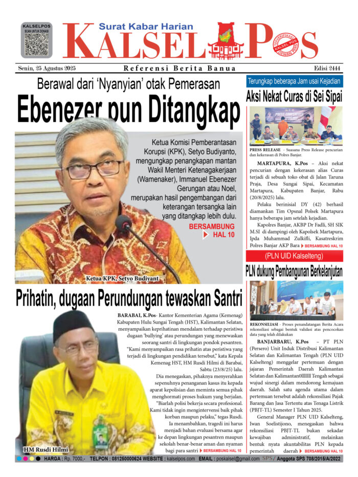 Ebenezer pun Ditangkap, Berawal dari ‘Nyanyian’ otak Pemerasan Zainal24 Agustus 2025691 views Ebenezer pun Ditangkap, Berawal dari ‘Nyanyian’ otak Pemerasan Prihatin, dugaan Perundungan tewaskan Santri Aksi Nekat Curas di Sei Sipai, Terungkap beberapa Jam usai Kejadian PLN dukung Pembangunan Berkelanjutan Download Epaper PDF Disini Bacaan LainnyaTerkait Korupsi Dana Desa Rp657 juta, Eks Kades di Kusan Hilir divonis 3 TahunDireksi baru PAM Bandarmasih terbentuk, Zulbadi dipercaya jadi DirutParkir Pasar Wadai ‘mencekik’, Pengendara Motor ditagih Rp10 Ribu Download Epaper PDF Disini Kalsel Pos Berita Terkini, Kabar Terbaru Hari ini Banjarmasin Kalimantan Selatan dan Nasional Pos terkaitTerkait Korupsi Dana Desa Rp657 juta, Eks Kades di Kusan Hilir divonis 3 TahunDireksi baru PAM Bandarmasih terbentuk, Zulbadi dipercaya jadi DirutParkir Pasar Wadai ‘mencekik’, Pengendara Motor ditagih Rp10 Ribu