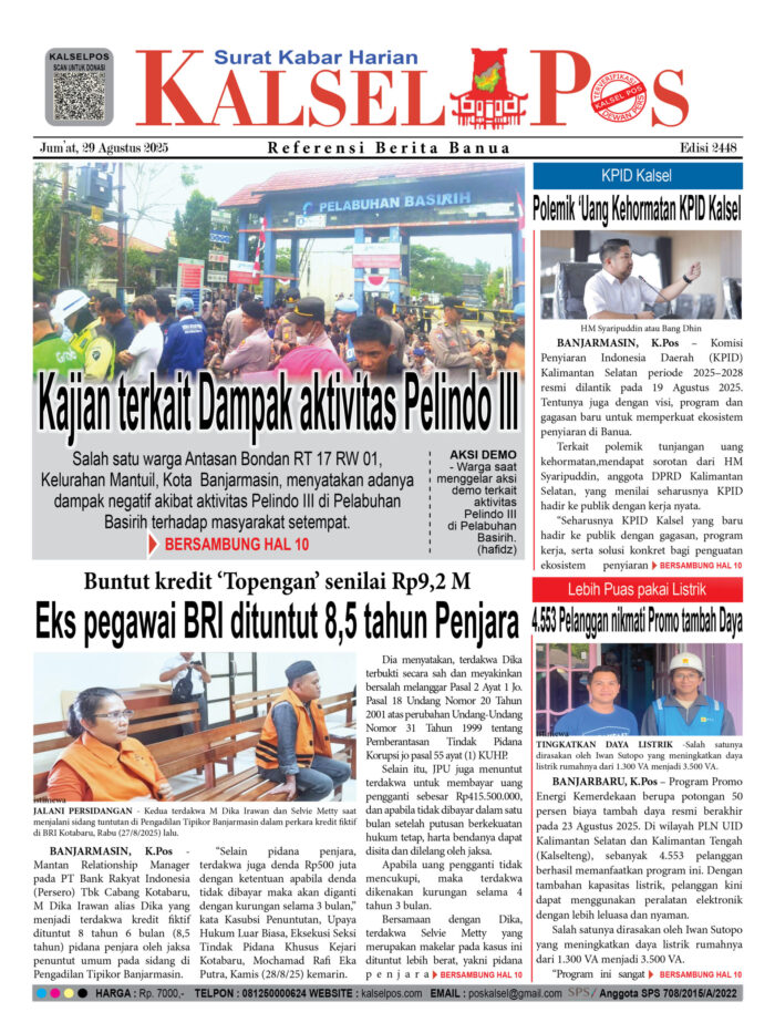 Kajian terkait Dampak aktivitas Pelindo III Zainal29 Agustus 2025815 views Kajian terkait Dampak aktivitas Pelindo III Eks pegawai BRI dituntut 8,5 tahun Penjara Polemik ‘Uang Kehormatan KPID Kalsel 4.553 Pelanggan nikmati Promo tambah Daya, Lebih Puas pakai Listrik Download Epaper PDF Disini Bacaan LainnyaTerkait Korupsi Dana Desa Rp657 juta, Eks Kades di Kusan Hilir divonis 3 TahunDireksi baru PAM Bandarmasih terbentuk, Zulbadi dipercaya jadi DirutParkir Pasar Wadai ‘mencekik’, Pengendara Motor ditagih Rp10 Ribu Download Epaper PDF Disini Kalsel Pos Berita Terkini, Kabar Terbaru Hari ini Banjarmasin Kalimantan Selatan dan Nasional Pos terkaitTerkait Korupsi Dana Desa Rp657 juta, Eks Kades di Kusan Hilir divonis 3 TahunDireksi baru PAM Bandarmasih terbentuk, Zulbadi dipercaya jadi DirutParkir Pasar Wadai ‘mencekik’, Pengendara Motor ditagih Rp10 Ribu