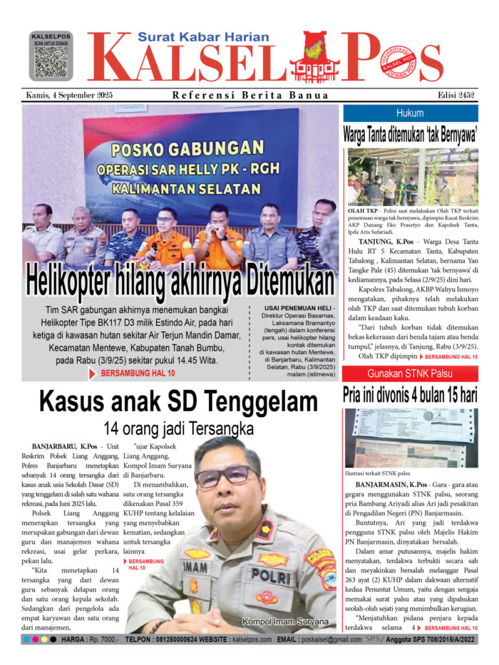 Helikopter hilang akhirnya Ditemukan Zainal3 September 2025827 views Helikopter hilang akhirnya Ditemukan Kasus anak SD Tenggelam, 14 orang jadi Tersangka Warga Tanta ditemukan ‘tak Bernyawa’ Pria ini divonis 4 bulan 15 hari, Gunakan STNK Palsu Download Epaper PDF Disini Bacaan LainnyaTerkait Korupsi Dana Desa Rp657 juta, Eks Kades di Kusan Hilir divonis 3 TahunDireksi baru PAM Bandarmasih terbentuk, Zulbadi dipercaya jadi DirutParkir Pasar Wadai ‘mencekik’, Pengendara Motor ditagih Rp10 Ribu Download Epaper PDF Disini Kalsel Pos Berita Terkini, Kabar Terbaru Hari ini Banjarmasin Kalimantan Selatan dan Nasional Pos terkaitTerkait Korupsi Dana Desa Rp657 juta, Eks Kades di Kusan Hilir divonis 3 TahunDireksi baru PAM Bandarmasih terbentuk, Zulbadi dipercaya jadi DirutParkir Pasar Wadai ‘mencekik’, Pengendara Motor ditagih Rp10 Ribu