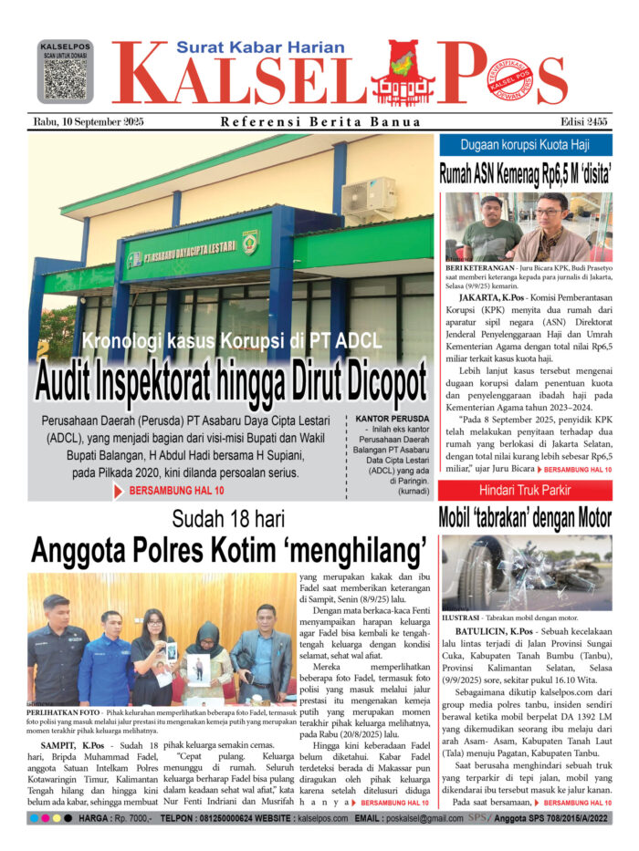 Audit Inspektorat hingga Dirut Dicopot, Kronologi kasus Korupsi di PT ADCL Zainal10 September 2025717 views Audit Inspektorat hingga Dirut Dicopot, Kronologi kasus Korupsi di PT ADCL Anggota Polres Kotim ‘menghilang’, Sudah 18 hari Rumah ASN Kemenag Rp6,5 M ‘disita’, Dugaan korupsi Kuota Haji Mobil ‘tabrakan’ dengan Motor, Hindari Truk Parkir Download Epaper PDF Disini Bacaan LainnyaTerkait Korupsi Dana Desa Rp657 juta, Eks Kades di Kusan Hilir divonis 3 TahunDireksi baru PAM Bandarmasih terbentuk, Zulbadi dipercaya jadi DirutParkir Pasar Wadai ‘mencekik’, Pengendara Motor ditagih Rp10 Ribu Download Epaper PDF Disini Kalsel Pos Berita Terkini, Kabar Terbaru Hari ini Banjarmasin Kalimantan Selatan dan Nasional Pos terkaitTerkait Korupsi Dana Desa Rp657 juta, Eks Kades di Kusan Hilir divonis 3 TahunDireksi baru PAM Bandarmasih terbentuk, Zulbadi dipercaya jadi DirutParkir Pasar Wadai ‘mencekik’, Pengendara Motor ditagih Rp10 Ribu