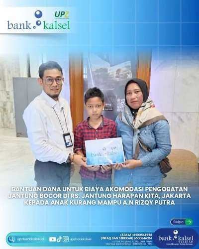 Banjarmasi, kalsepos.com – Unit Pengumpul Zakat (UPZ) Bank Kalsel kembali menunjukkan kepeduliannya dengan menyalurkan bantuan kesehatan kepada Rizqy Putra, seorang anak yang sudah satu tahun terakhir berjuang melawan penyakit jantung bocor dan harus menjalani kontrol rutin setiap bulan.