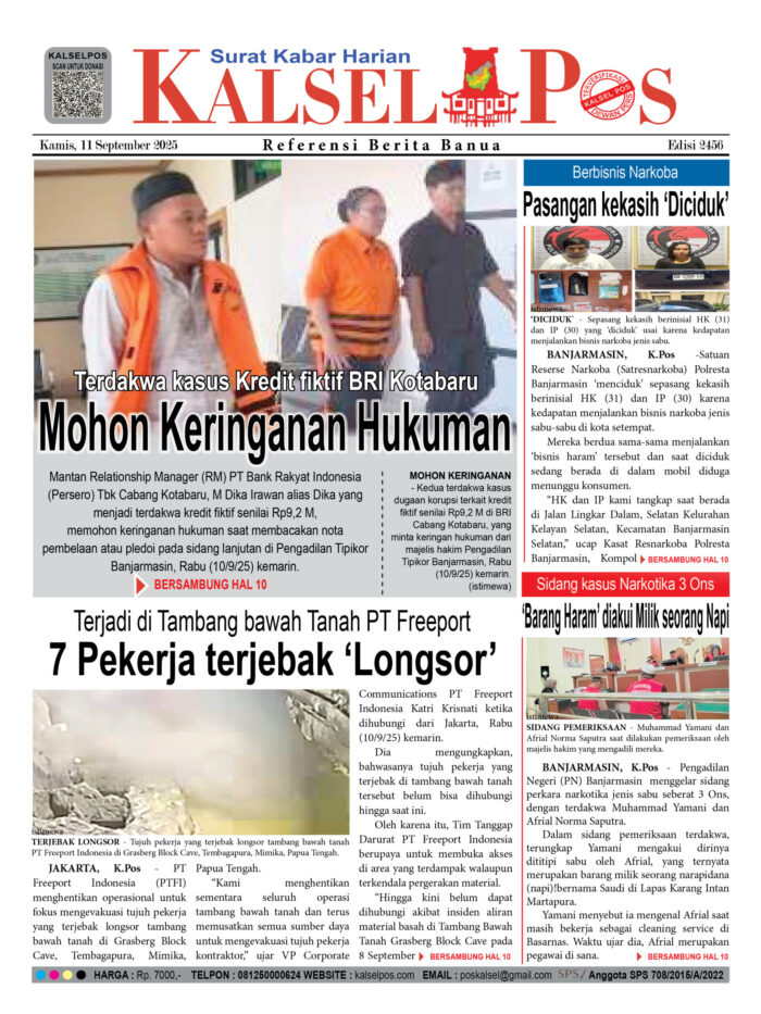 Mohon Keringanan Hukuman, Terdakwa kasus Kredit fiktif BRI Kotabaru Zainal11 September 2025638 views Mohon Keringanan Hukuman, Terdakwa kasus Kredit fiktif BRI Kotabaru 7 Pekerja terjebak ‘Longsor’, Terjadi di Tambang bawah Tanah PT Freeport Pasangan kekasih ‘Diciduk’, Berbisnis Narkoba ‘Barang Haram’ diakui Milik seorang Napi, Sidang kasus Narkotika 3 Ons Download Epaper PDF Disini Bacaan LainnyaTerkait Korupsi Dana Desa Rp657 juta, Eks Kades di Kusan Hilir divonis 3 TahunDireksi baru PAM Bandarmasih terbentuk, Zulbadi dipercaya jadi DirutParkir Pasar Wadai ‘mencekik’, Pengendara Motor ditagih Rp10 Ribu Download Epaper PDF Disini Kalsel Pos Berita Terkini, Kabar Terbaru Hari ini Banjarmasin Kalimantan Selatan dan Nasional Pos terkaitTerkait Korupsi Dana Desa Rp657 juta, Eks Kades di Kusan Hilir divonis 3 TahunDireksi baru PAM Bandarmasih terbentuk, Zulbadi dipercaya jadi DirutParkir Pasar Wadai ‘mencekik’, Pengendara Motor ditagih Rp10 Ribu