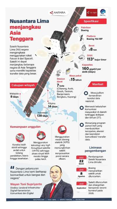 kalselpos.com – Satelit Nusantara Lima (N5) segera mengangkasa menggunakan roket Falcon 9 dari SpaceX. Satelit ini dapat menjangkau beberapa negara di Asia Tenggara serta memiliki kapasitas transfer data yang besar.