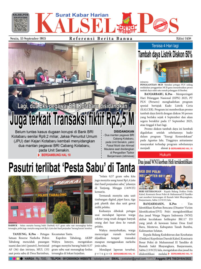 Juga terkait Transaksi fiktif Rp2,5 M, Lagi, dua Eks pegawai BRI Kotabaru disidangkan Zainal15 September 202515 September 2025751 views Juga terkait Transaksi fiktif Rp2,5 M, Lagi, dua Eks pegawai BRI Kotabaru disidangkan Pasutri terlibat ‘Pesta Sabu’ di Tanta Tambah daya Listrik Diskon 50%, Tersisa 4 Hari lagi Dua jasad WNI korban Heli teridentifikasi Download Epaper PDF Disini Bacaan LainnyaTerkait Korupsi Dana Desa Rp657 juta, Eks Kades di Kusan Hilir divonis 3 TahunDireksi baru PAM Bandarmasih terbentuk, Zulbadi dipercaya jadi DirutParkir Pasar Wadai ‘mencekik’, Pengendara Motor ditagih Rp10 Ribu Download Epaper PDF Disini Kalsel Pos Berita Terkini, Kabar Terbaru Hari ini Banjarmasin Kalimantan Selatan dan Nasional Pos terkaitTerkait Korupsi Dana Desa Rp657 juta, Eks Kades di Kusan Hilir divonis 3 TahunDireksi baru PAM Bandarmasih terbentuk, Zulbadi dipercaya jadi DirutParkir Pasar Wadai ‘mencekik’, Pengendara Motor ditagih Rp10 Ribu