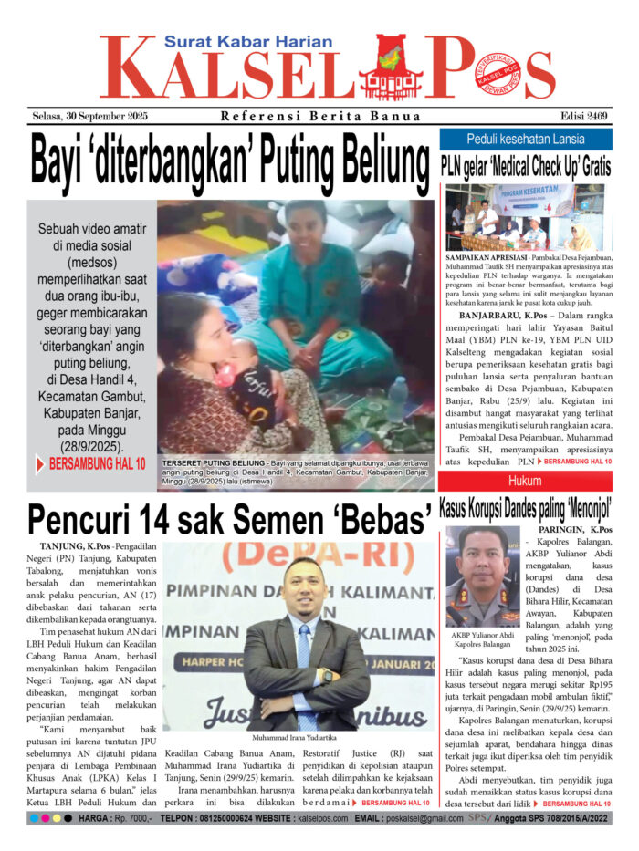 Bayi ‘diterbangkan’ Puting Beliung Zainal29 September 2025477 views Bayi ‘diterbangkan’ Puting Beliung Pencuri 14 sak Semen ‘Bebas’ Peduli kesehatan Lansia, PLN gelar ‘Medical Check Up’ Gratis Kasus Korupsi Dandes paling ‘Menonjol’ Download Epaper PDF Disini Bacaan LainnyaTerkait Korupsi Dana Desa Rp657 juta, Eks Kades di Kusan Hilir divonis 3 TahunDireksi baru PAM Bandarmasih terbentuk, Zulbadi dipercaya jadi DirutParkir Pasar Wadai ‘mencekik’, Pengendara Motor ditagih Rp10 Ribu Download Epaper PDF Disini Kalsel Pos Berita Terkini, Kabar Terbaru Hari ini Banjarmasin Kalimantan Selatan dan Nasional Pos terkaitTerkait Korupsi Dana Desa Rp657 juta, Eks Kades di Kusan Hilir divonis 3 TahunDireksi baru PAM Bandarmasih terbentuk, Zulbadi dipercaya jadi DirutParkir Pasar Wadai ‘mencekik’, Pengendara Motor ditagih Rp10 Ribu