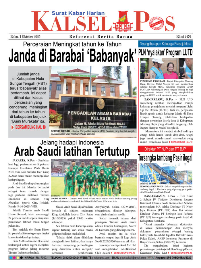 Perceraian Meningkat tahun ke Tahun, Janda di Barabai ‘Babanyak’ Zainal30 September 202530 September 2025882 views Perceraian Meningkat tahun ke Tahun, Janda di Barabai ‘Babanyak’ Arab Saudi latihan Tertutup, Jelang hadapi Indonesia PLN ‘nyalakan’ Program LUTD, Terangi harapan Keluarga Prasejahtera Direktur PT NJP dan PT BJP, Direktur PT NJP dan PT BJP Download Epaper PDF Disini Bacaan LainnyaBuruh dikeroyok Hingga Tewas, Tersangka Pelaku Serahkan DiriTiga sopir Positif narkoba, Terjaring razia tes Urine BNNK BalanganParkir “Nakal” Pasar Wadai disikat, Lahan yang Tarik Rp10 Ribu disegel Download Epaper PDF Disini Kalsel Pos Berita Terkini, Kabar Terbaru Hari ini Banjarmasin Kalimantan Selatan dan Nasional Pos terkaitBuruh dikeroyok Hingga Tewas, Tersangka Pelaku Serahkan DiriTiga sopir Positif narkoba, Terjaring razia tes Urine BNNK BalanganParkir “Nakal” Pasar Wadai disikat, Lahan yang Tarik Rp10 Ribu disegel