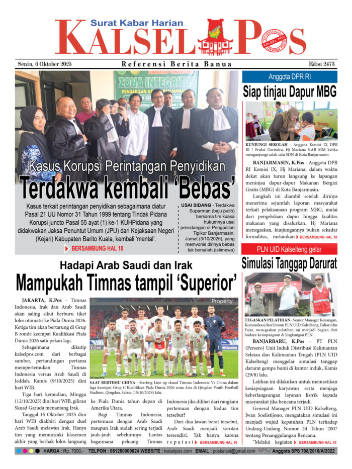 Kasus Korupsi Perintangan Penyidikan, Terdakwa kembali ‘Bebas’ Zainal6 Oktober 2025572 views Kasus Korupsi Perintangan Penyidikan, Terdakwa kembali ‘Bebas’ Hadapi Arab Saudi dan Irak, Mampukah Timnas tampil ‘Superior’ Anggota DPR RI, Siap tinjau Dapur MBG PLN UID Kalselteng gelar, Simulasi Tanggap Darurat Download Epaper PDF Disini Bacaan LainnyaTerkait Korupsi Dana Desa Rp657 juta, Eks Kades di Kusan Hilir divonis 3 TahunDireksi baru PAM Bandarmasih terbentuk, Zulbadi dipercaya jadi DirutParkir Pasar Wadai ‘mencekik’, Pengendara Motor ditagih Rp10 Ribu Download Epaper PDF Disini Kalsel Pos Berita Terkini, Kabar Terbaru Hari ini Banjarmasin Kalimantan Selatan dan Nasional Pos terkaitTerkait Korupsi Dana Desa Rp657 juta, Eks Kades di Kusan Hilir divonis 3 TahunDireksi baru PAM Bandarmasih terbentuk, Zulbadi dipercaya jadi DirutParkir Pasar Wadai ‘mencekik’, Pengendara Motor ditagih Rp10 Ribu