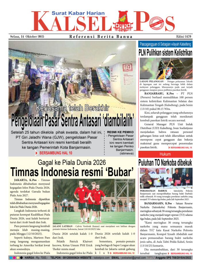 Pengelolaan Pasar Sentra Antasari ‘diambilalih’ Zainal14 Oktober 2025459 views Pengelolaan Pasar Sentra Antasari ‘diambilalih’ Timnas Indonesia resmi ‘Bubar’ PLN Pulihkan sistem Kelistrikan Puluhan TO Narkoba dibekuk Download Epaper PDF Disini Bacaan LainnyaBuruh dikeroyok Hingga Tewas, Tersangka Pelaku Serahkan DiriTiga sopir Positif narkoba, Terjaring razia tes Urine BNNK BalanganParkir “Nakal” Pasar Wadai disikat, Lahan yang Tarik Rp10 Ribu disegel Download Epaper PDF Disini Kalsel Pos Berita Terkini, Kabar Terbaru Hari ini Banjarmasin Kalimantan Selatan dan Nasional Pos terkaitBuruh dikeroyok Hingga Tewas, Tersangka Pelaku Serahkan DiriTiga sopir Positif narkoba, Terjaring razia tes Urine BNNK BalanganParkir “Nakal” Pasar Wadai disikat, Lahan yang Tarik Rp10 Ribu disegel