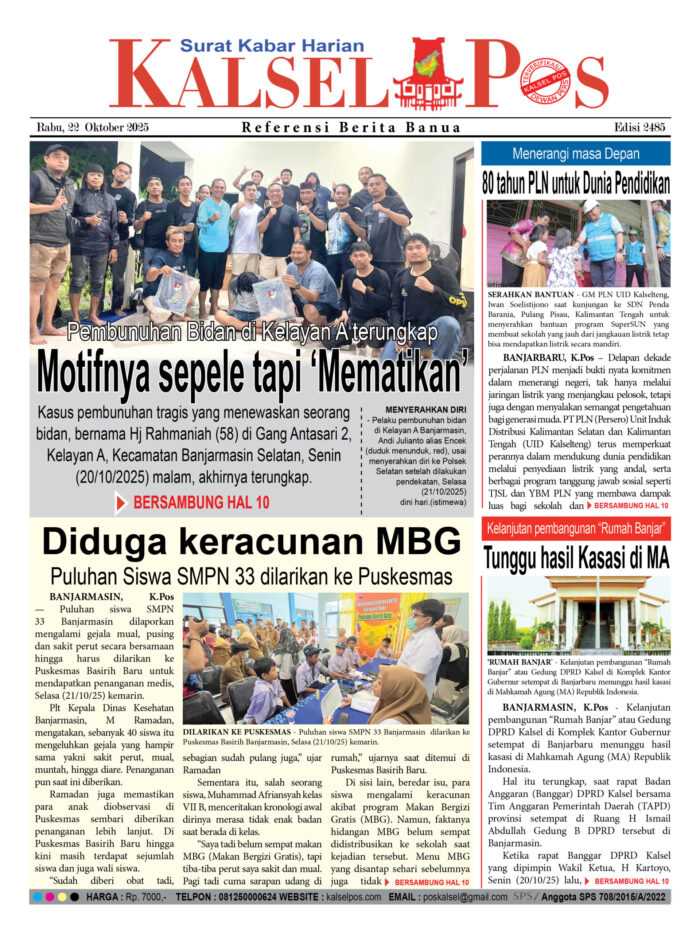 Pembunuhan Bidan di Kelayan A terungkap Zainal21 Oktober 2025706 views Pembunuhan Bidan di Kelayan A terungkap Diduga keracunan MBG, Puluhan Siswa SMPN 33 dilarikan ke Puskesmas Menerangi masa Depan, 80 tahun PLN untuk Dunia Pendidikan Kelanjutan pembangunan “Rumah Banjar”, Tunggu hasil Kasasi di MA Download Epaper PDF Disini Bacaan LainnyaTerkait Korupsi Dana Desa Rp657 juta, Eks Kades di Kusan Hilir divonis 3 TahunDireksi baru PAM Bandarmasih terbentuk, Zulbadi dipercaya jadi DirutParkir Pasar Wadai ‘mencekik’, Pengendara Motor ditagih Rp10 Ribu Download Epaper PDF Disini Kalsel Pos Berita Terkini, Kabar Terbaru Hari ini Banjarmasin Kalimantan Selatan dan Nasional Pos terkaitTerkait Korupsi Dana Desa Rp657 juta, Eks Kades di Kusan Hilir divonis 3 TahunDireksi baru PAM Bandarmasih terbentuk, Zulbadi dipercaya jadi DirutParkir Pasar Wadai ‘mencekik’, Pengendara Motor ditagih Rp10 Ribu