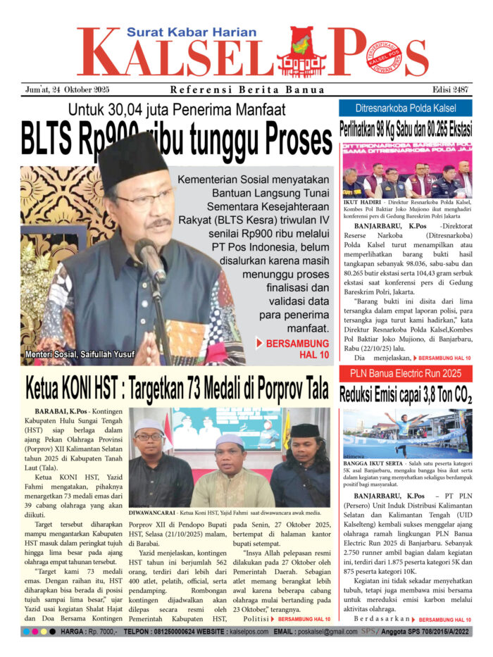 Untuk 30,04 juta Penerima BLTS Rp900 ribu tunggu Proses Zainal23 Oktober 2025546 views BLTS Rp900 ribu tunggu Proses Ketua KONI HST :Targetkan 73 Medali di Porprov Tala Perlihatkan 98 Kg Sabu dan 80.265 Ekstasi PLN Banua Electric Run 2025 Download Epaper PDF Disini Bacaan LainnyaTerkait Korupsi Dana Desa Rp657 juta, Eks Kades di Kusan Hilir divonis 3 TahunDireksi baru PAM Bandarmasih terbentuk, Zulbadi dipercaya jadi DirutParkir Pasar Wadai ‘mencekik’, Pengendara Motor ditagih Rp10 Ribu Download Epaper PDF Disini Kalsel Pos Berita Terkini, Kabar Terbaru Hari ini Banjarmasin Kalimantan Selatan dan Nasional Pos terkaitTerkait Korupsi Dana Desa Rp657 juta, Eks Kades di Kusan Hilir divonis 3 TahunDireksi baru PAM Bandarmasih terbentuk, Zulbadi dipercaya jadi DirutParkir Pasar Wadai ‘mencekik’, Pengendara Motor ditagih Rp10 Ribu