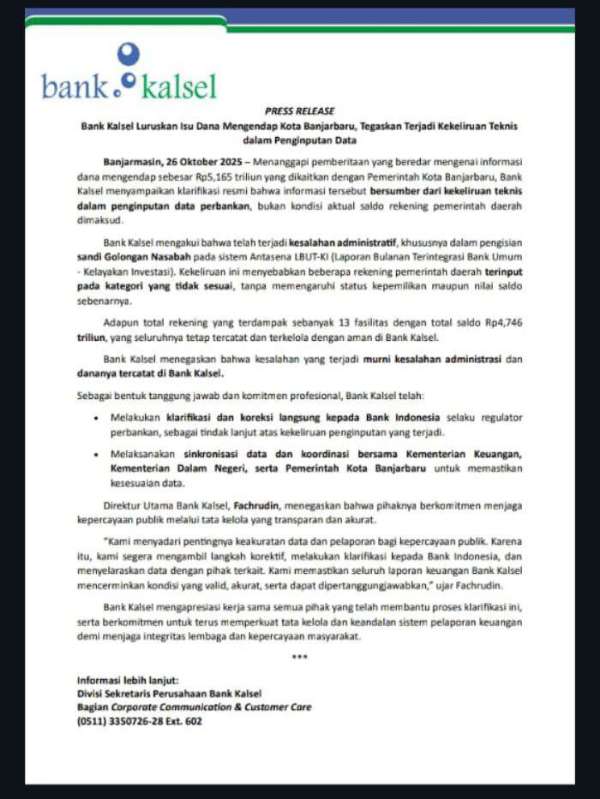 “Kesalahan ini murni administratif, tidak ada dana yang hilang atau mengendap. Seluruh saldo nasabah, termasuk pemerintah daerah, aman dan tercatat dengan benar,” tegas Fachrudin, Sabtu (26/10/2025) lalu.