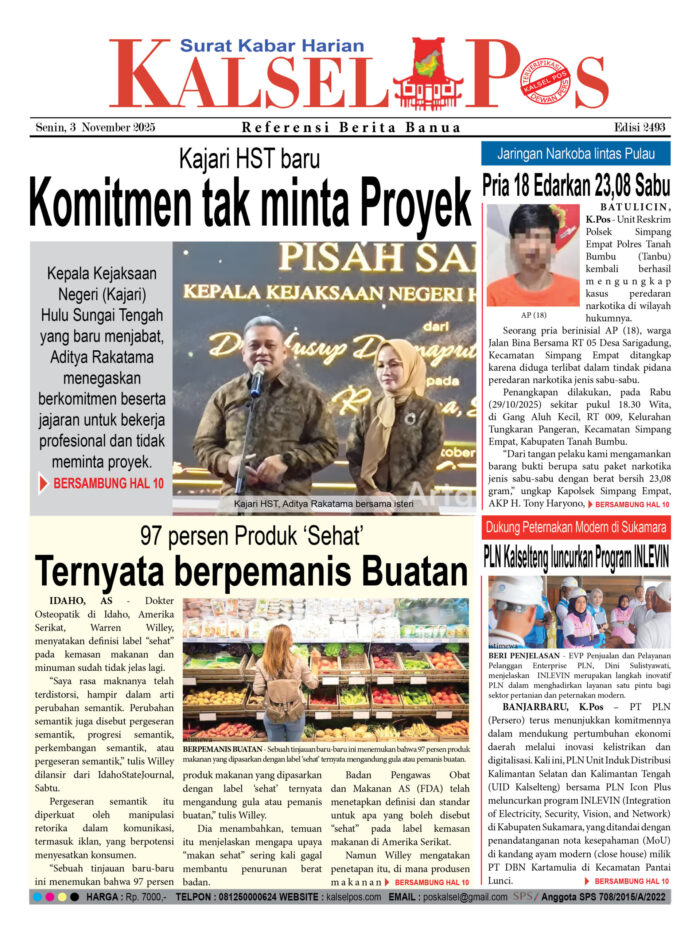 Kajari HST baru, Komitmen tak minta Proyek Zainal2 November 2025394 views Kajari HST baru, Komitmen tak minta Proyek 97 persen Produk ‘Sehat’, Ternyata berpemanis Buatan Pria 18 Edarkan 23,08 Sabu PLN Kalselteng luncurkan Program INLEVIN Download Epaper PDF Disini Bacaan LainnyaTerkait Korupsi Dana Desa Rp657 juta, Eks Kades di Kusan Hilir divonis 3 TahunDireksi baru PAM Bandarmasih terbentuk, Zulbadi dipercaya jadi DirutParkir Pasar Wadai ‘mencekik’, Pengendara Motor ditagih Rp10 Ribu Download Epaper PDF Disini Kalsel Pos Berita Terkini, Kabar Terbaru Hari ini Banjarmasin Kalimantan Selatan dan Nasional Pos terkaitTerkait Korupsi Dana Desa Rp657 juta, Eks Kades di Kusan Hilir divonis 3 TahunDireksi baru PAM Bandarmasih terbentuk, Zulbadi dipercaya jadi DirutParkir Pasar Wadai ‘mencekik’, Pengendara Motor ditagih Rp10 Ribu