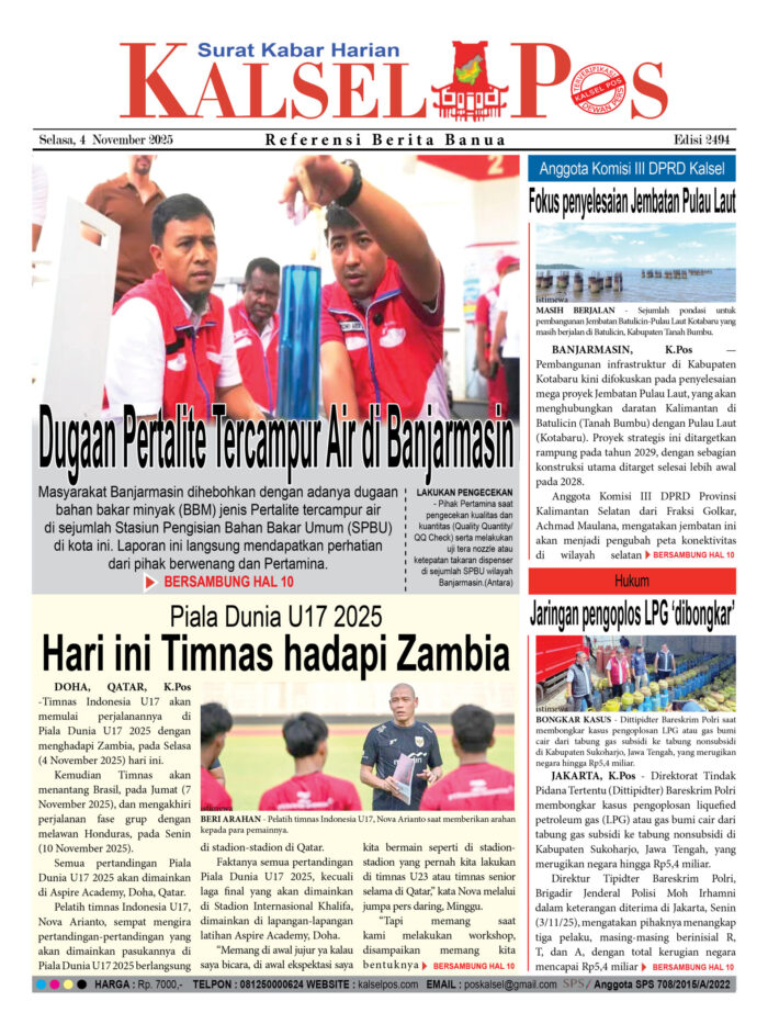 Dugaan Pertalite Tercampur Air di Banjarmasin Zainal3 November 2025417 views Dugaan Pertalite Tercampur Air di Banjarmasin Piala Dunia U17 2025, Hari ini Timnas hadapi Zambia Anggota Komisi III DPRD Kalsel. Fokus penyelesaian Jembatan Pulau Laut Jaringan pengoplos LPG ‘dibongkar’ Download Epaper PDF Disini Bacaan LainnyaTerkait Korupsi Dana Desa Rp657 juta, Eks Kades di Kusan Hilir divonis 3 TahunDireksi baru PAM Bandarmasih terbentuk, Zulbadi dipercaya jadi DirutParkir Pasar Wadai ‘mencekik’, Pengendara Motor ditagih Rp10 Ribu Download Epaper PDF Disini Kalsel Pos Berita Terkini, Kabar Terbaru Hari ini Banjarmasin Kalimantan Selatan dan Nasional Pos terkaitTerkait Korupsi Dana Desa Rp657 juta, Eks Kades di Kusan Hilir divonis 3 TahunDireksi baru PAM Bandarmasih terbentuk, Zulbadi dipercaya jadi DirutParkir Pasar Wadai ‘mencekik’, Pengendara Motor ditagih Rp10 Ribu