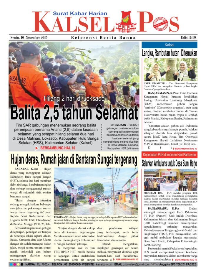 Hilang 2 hari di Loksado, Balita 2,5 tahun Selamat Zainal9 November 2025475 views Hilang 2 hari di Loksado, Balita 2,5 tahun Selamat Hujan deras, Rumah jalan di Bantaran Sungai tergenang Langka, Rambutan hutan Ditemukan Kepedulian PLN di momen Hari Pahlawan Download Epaper PDF Disini Bacaan Lainnya1 Kg Sabu berhasil Disita, Dari seorang Pengedar di HantakanBuruh dikeroyok Hingga Tewas, Tersangka Pelaku Serahkan DiriTiga sopir Positif narkoba, Terjaring razia tes Urine BNNK Balangan Download Epaper PDF Disini Kalsel Pos Berita Terkini, Kabar Terbaru Hari ini Banjarmasin Kalimantan Selatan dan Nasional Pos terkait1 Kg Sabu berhasil Disita, Dari seorang Pengedar di HantakanBuruh dikeroyok Hingga Tewas, Tersangka Pelaku Serahkan DiriTiga sopir Positif narkoba, Terjaring razia tes Urine BNNK Balangan
