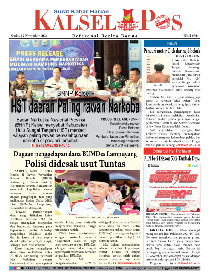 BNNP Kalsel : HST daerah Paling rawan Narkoba Zainal16 November 2025491 views BNNP Kalsel : HST daerah Paling rawan Narkoba Polisi didesak usut Tuntas, Dugaan penggelapan dana BUMDes Lampuyang Pencuri motor Ojek daring dibekuk PLN beri Diskon 50% Tambah Daya Download Epaper PDF Disini Bacaan LainnyaTerkait Korupsi Dana Desa Rp657 juta, Eks Kades di Kusan Hilir divonis 3 TahunDireksi baru PAM Bandarmasih terbentuk, Zulbadi dipercaya jadi DirutParkir Pasar Wadai ‘mencekik’, Pengendara Motor ditagih Rp10 Ribu Download Epaper PDF Disini Kalsel Pos Berita Terkini, Kabar Terbaru Hari ini Banjarmasin Kalimantan Selatan dan Nasional Pos terkaitTerkait Korupsi Dana Desa Rp657 juta, Eks Kades di Kusan Hilir divonis 3 TahunDireksi baru PAM Bandarmasih terbentuk, Zulbadi dipercaya jadi DirutParkir Pasar Wadai ‘mencekik’, Pengendara Motor ditagih Rp10 Ribu