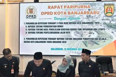 Pengesahan keempat perda tersebut dilakukan melalui rapat paripurna yang dipimpin Ketua DPRD Banjarbaru Gusti Rizky Sukma Iskandar Putera bersama dua unsur pimpinan, serta dihadiri Wakil Wali Kota Wartono di Gedung DPRD Banjarbaru, Kamis (13/11/2025) lalu.