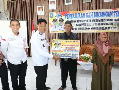 Kandangan, kalselpos.com– Wakil Bupati (Wabup).Hulu Sungai Selatan (HSS) Suriani menyerahkan Bantuan Sosial (Bansos) Program Rumah Sejahtera (PRS) bagi warga yang kurang mampu, wilayah Kecamatan Daha Selatan, Kecamatan Daha Utara dan Kecamatan Barat, di Aula Kantor Kecamatan Daha Selatan, Rabu (19/11/2025).