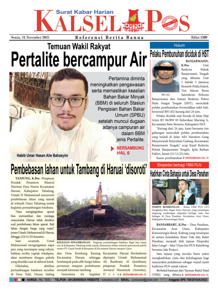 Temuan Wakil Rakyat, Pertalite bercampur Air Zainal24 November 20251,284 views Temuan Wakil Rakyat, Pertalite bercampur Air Pembebasan lahan untuk Tambang di Haruai ‘disoroti’ Pelaku Pembunuhan diciduk di HST Ekspedisi berbagi YBM PLN, Hadirkan Cinta Bahagia untuk Desa Panahan Download Epaper PDF Disini Bacaan LainnyaBuruh dikeroyok Hingga Tewas, Tersangka Pelaku Serahkan DiriTiga sopir Positif narkoba, Terjaring razia tes Urine BNNK BalanganParkir “Nakal” Pasar Wadai disikat, Lahan yang Tarik Rp10 Ribu disegel Download Epaper PDF Disini Kalsel Pos Berita Terkini, Kabar Terbaru Hari ini Banjarmasin Kalimantan Selatan dan Nasional Pos terkaitBuruh dikeroyok Hingga Tewas, Tersangka Pelaku Serahkan DiriTiga sopir Positif narkoba, Terjaring razia tes Urine BNNK BalanganParkir “Nakal” Pasar Wadai disikat, Lahan yang Tarik Rp10 Ribu disegel
