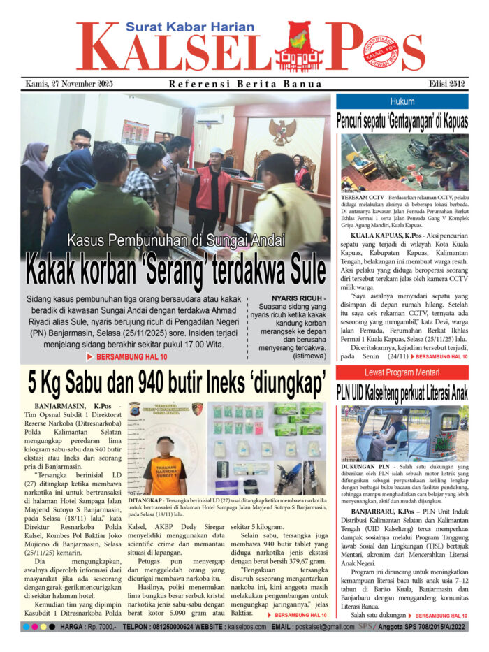 Kasus Pembunuhan di Sungai Andai, Kakak korban ‘Serang’ terdakwa Sule Zainal27 November 2025733 views Kasus Pembunuhan di Sungai Andai, Kakak korban ‘Serang’ terdakwa Sule 5 Kg Sabu dan 940 butir Ineks ‘diungkap’ Pencuri sepatu ‘Gentayangan’ di Kapuas Lewat Program Mentari, PLN UID Kalselteng perkuat Literasi Anak Download Epaper PDF Disini Bacaan LainnyaTerkait Korupsi Dana Desa Rp657 juta, Eks Kades di Kusan Hilir divonis 3 TahunDireksi baru PAM Bandarmasih terbentuk, Zulbadi dipercaya jadi DirutParkir Pasar Wadai ‘mencekik’, Pengendara Motor ditagih Rp10 Ribu Download Epaper PDF Disini Kalsel Pos Berita Terkini, Kabar Terbaru Hari ini Banjarmasin Kalimantan Selatan dan Nasional Pos terkaitTerkait Korupsi Dana Desa Rp657 juta, Eks Kades di Kusan Hilir divonis 3 TahunDireksi baru PAM Bandarmasih terbentuk, Zulbadi dipercaya jadi DirutParkir Pasar Wadai ‘mencekik’, Pengendara Motor ditagih Rp10 Ribu