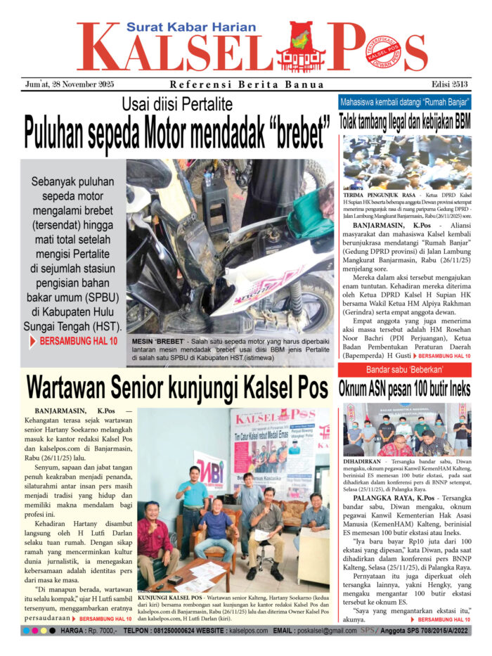 Usai diisi Pertalite, Puluhan sepeda Motor mendadak “brebet” Zainal28 November 2025748 views Usai diisi Pertalite, Puluhan sepeda Motor mendadak “brebet” Wartawan Senior kunjungi Kalsel Pos Mahasiswa kembali datangi “Rumah Banjar”, Tolak tambang Ilegal dan kebijakan BBM Bandar sabu ‘Beberkan’, Oknum ASN pesan 100 butir Ineks Download Epaper PDF Disini Bacaan LainnyaTerkait Korupsi Dana Desa Rp657 juta, Eks Kades di Kusan Hilir divonis 3 TahunDireksi baru PAM Bandarmasih terbentuk, Zulbadi dipercaya jadi DirutParkir Pasar Wadai ‘mencekik’, Pengendara Motor ditagih Rp10 Ribu Download Epaper PDF Disini Kalsel Pos Berita Terkini, Kabar Terbaru Hari ini Banjarmasin Kalimantan Selatan dan Nasional Pos terkaitTerkait Korupsi Dana Desa Rp657 juta, Eks Kades di Kusan Hilir divonis 3 TahunDireksi baru PAM Bandarmasih terbentuk, Zulbadi dipercaya jadi DirutParkir Pasar Wadai ‘mencekik’, Pengendara Motor ditagih Rp10 Ribu