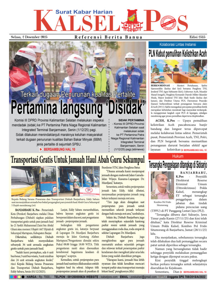 Terkait dugaan Penurunan kualitas Pertalite, Pertamina langsung ‘Disidak’ Zainal2 Desember 2025593 views Terkait dugaan Penurunan kualitas Pertalite, Pertamina langsung ‘Disidak’ Transportasi Gratis Untuk Jamaah Haul Abah Guru Sekumpul Kolaborasi Lintas Instansi, PLN Kebut pemulihan Kelistrikan Aceh Tersangka Penggelapan ditangkap di Sidoarjo Download Epaper PDF Disini Bacaan LainnyaTerkait Korupsi Dana Desa Rp657 juta, Eks Kades di Kusan Hilir divonis 3 TahunDireksi baru PAM Bandarmasih terbentuk, Zulbadi dipercaya jadi DirutParkir Pasar Wadai ‘mencekik’, Pengendara Motor ditagih Rp10 Ribu Download Epaper PDF Disini Kalsel Pos Berita Terkini, Kabar Terbaru Hari ini Banjarmasin Kalimantan Selatan dan Nasional Pos terkaitTerkait Korupsi Dana Desa Rp657 juta, Eks Kades di Kusan Hilir divonis 3 TahunDireksi baru PAM Bandarmasih terbentuk, Zulbadi dipercaya jadi DirutParkir Pasar Wadai ‘mencekik’, Pengendara Motor ditagih Rp10 Ribu