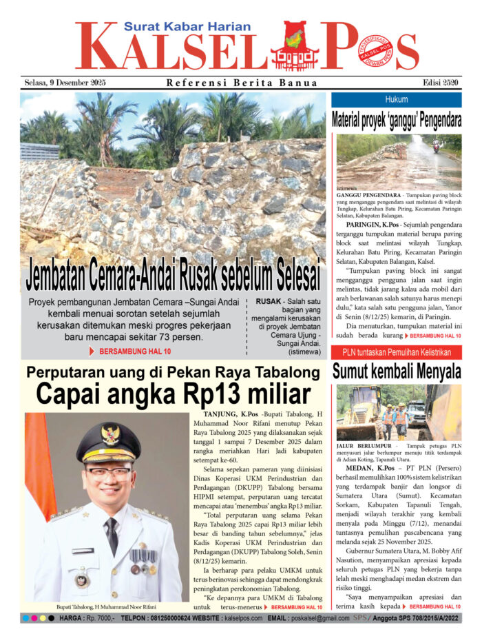 Jembatan Cemara-Andai Rusak sebelum Selesai Zainal9 Desember 20251,540 views Jembatan Cemara-Andai Rusak sebelum Selesai Perputaran uang di Pekan Raya Tabalong, Capai angka Rp13 miliar Material proyek ‘ganggu’ Pengendara PLN tuntaskan Pemulihan Kelistrikan, Sumut kembali Menyala Download Epaper PDF Disini Bacaan LainnyaTerkait Korupsi Dana Desa Rp657 juta, Eks Kades di Kusan Hilir divonis 3 TahunDireksi baru PAM Bandarmasih terbentuk, Zulbadi dipercaya jadi DirutParkir Pasar Wadai ‘mencekik’, Pengendara Motor ditagih Rp10 Ribu Download Epaper PDF Disini Kalsel Pos Berita Terkini, Kabar Terbaru Hari ini Banjarmasin Kalimantan Selatan dan Nasional Pos terkaitTerkait Korupsi Dana Desa Rp657 juta, Eks Kades di Kusan Hilir divonis 3 TahunDireksi baru PAM Bandarmasih terbentuk, Zulbadi dipercaya jadi DirutParkir Pasar Wadai ‘mencekik’, Pengendara Motor ditagih Rp10 Ribu