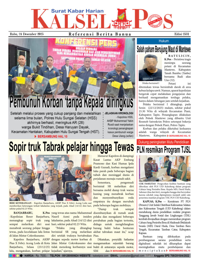 Pembunuh Korban ‘tanpa Kepala’ diringkus Zainal24 Desember 2025598 views Pembunuh Korban ‘tanpa Kepala’ diringkus Sopir truk Tabrak pelajar hingga Tewas Salah paham Berujung Maut di Mantewe Dukung peningkatan Mutu Pendidikan, PLN resmikan Program TJSL Download Epaper PDF Disini Bacaan LainnyaTerkait Korupsi Dana Desa Rp657 juta, Eks Kades di Kusan Hilir divonis 3 TahunDireksi baru PAM Bandarmasih terbentuk, Zulbadi dipercaya jadi DirutParkir Pasar Wadai ‘mencekik’, Pengendara Motor ditagih Rp10 Ribu Download Epaper PDF Disini Kalsel Pos Berita Terkini, Kabar Terbaru Hari ini Banjarmasin Kalimantan Selatan dan Nasional Pos terkaitTerkait Korupsi Dana Desa Rp657 juta, Eks Kades di Kusan Hilir divonis 3 TahunDireksi baru PAM Bandarmasih terbentuk, Zulbadi dipercaya jadi DirutParkir Pasar Wadai ‘mencekik’, Pengendara Motor ditagih Rp10 Ribu